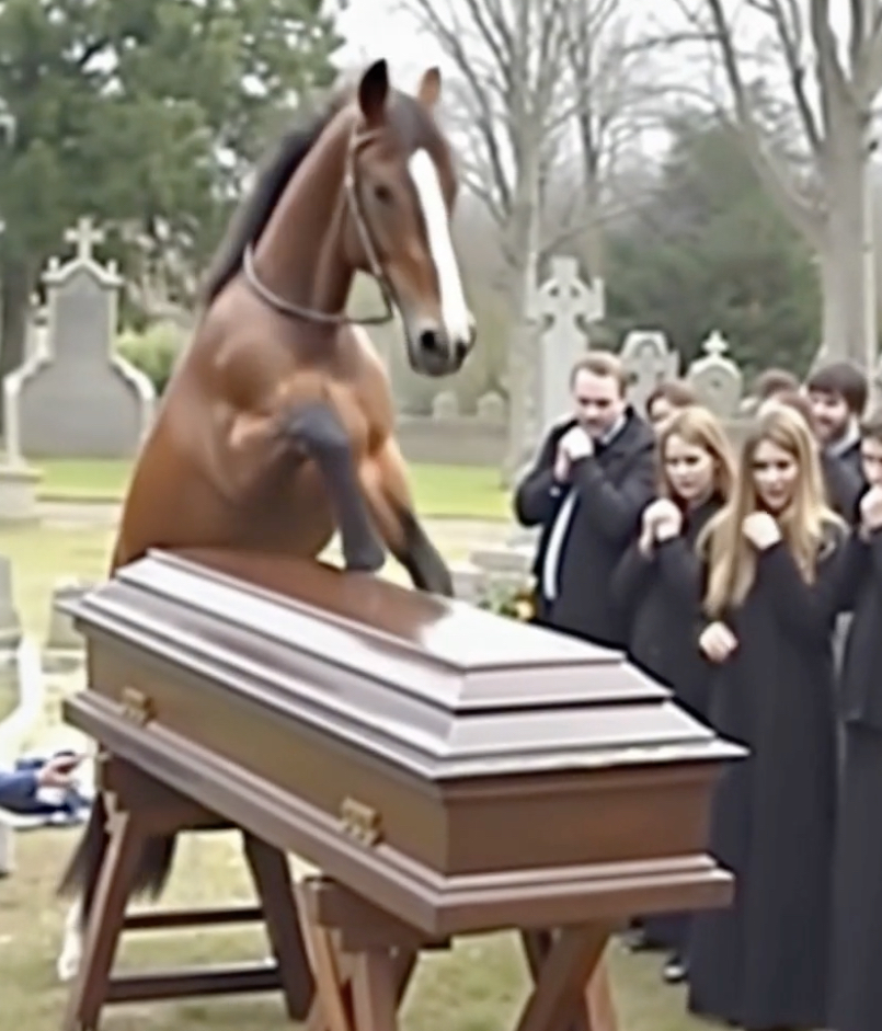 Ahora era una tempestad en plena furia, sus cascos golpeaban el suelo con un ritmo que resonaba por las calles estrechas y silenciosas. Su crin ondeaba hacia atrás como un estandarte, y sus ojos brillaban con algo que parecía casi un desafío. Al llegar al ataúd, la multitud se apartó como si una mano invisible la hubiera ordenado. No había forma de contenerla; era una fuerza de la naturaleza, imparable y resuelta.