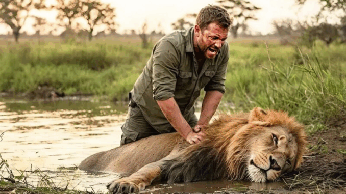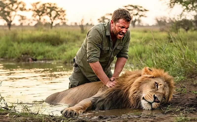Finalmente, con un esfuerzo increíble, logró arrastrar al animal hasta la orilla. El león yacía inmóvil, con el pecho sin moverse. Desesperado, el hombre se arrodilló a su lado y comenzó a realizarle compresiones torácicas. Sus palmas golpearon una y otra vez el pecho fuerte pero sin vida.