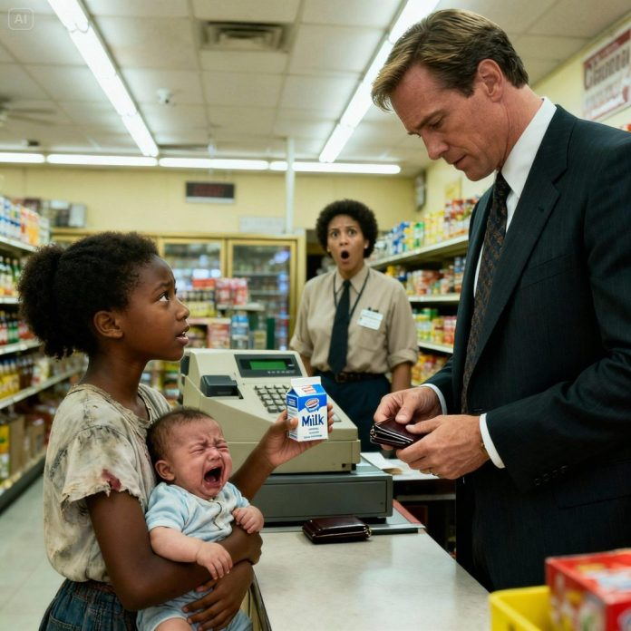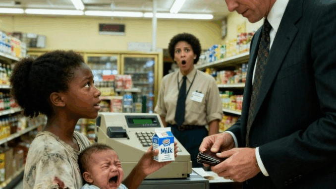 —Te prometo que te lo pagaré cuando sea mayor —dijo la niña con voz temblorosa. Se llamaba Amara Johnson y no tendría más de diez años. Estaba de pie en medio de una tienda de conveniencia abarrotada en el centro de Atlanta, abrazando un pequeño cartón de leche contra su pecho. A su lado, envuelto en una manta fina, su hermanito recién nacido gimoteaba suavemente; su llanto resonaba en la silenciosa tienda.