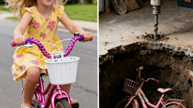 Bajo una losa de hormigón, cubierta de polvo y óxido, yacía una pequeña bicicleta rosa ; la cesta blanca estaba aplastada, pero aún se distinguía. Cintas moradas y rosas ondeaban tenuemente desde el manillar.