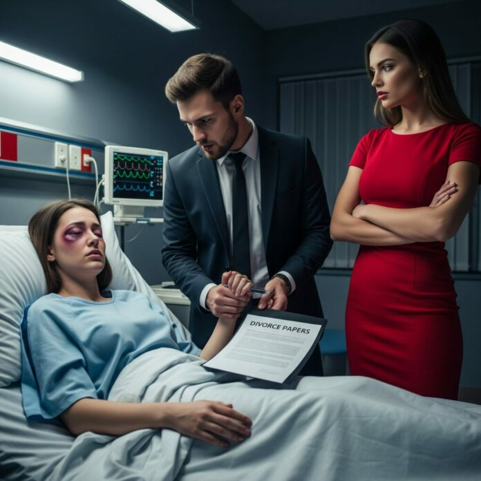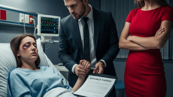 Horas después, Mark entró corriendo en la habitación del hospital. Ver el estado destrozado de su hermana le encendió una furia. Ella le contó todo: desde la discusión hasta la caída, pasando por los papeles del divorcio. Él escuchó, apretando la mandíbula con cada detalle.
