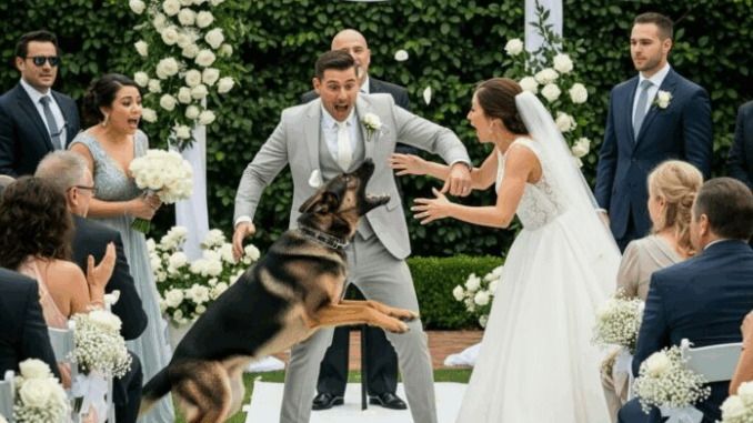 Desde detrás del arco floral, Max, su fiel pastor alemán y antiguo aprendiz de policía canino, irrumpió con un gruñido feroz. Su pelaje se erizó, dejó al descubierto los dientes y fijó la mirada en Mark. Antes de que nadie pudiera reaccionar, Max se abalanzó y le clavó los dientes en la pierna.