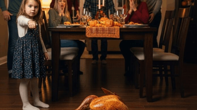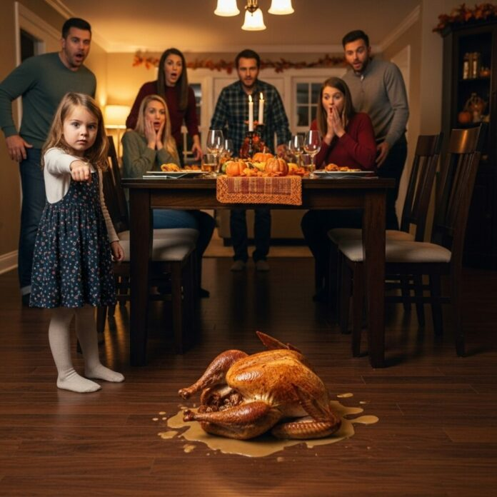 En la cena de Acción de Gracias, mi hija de cinco años gritó de repente, corrió a la mesa y tiró el pavo entero al suelo. Toda la familia se quedó paralizada. Me arrodillé, intentando mantener la calma, y ​​le pregunté: “¿Por qué hiciste eso?”. Jadeó, levantando las manos como si acabara de salvar al mundo. “¡Porque los salvé a todos!”. Nadie lo entendió…