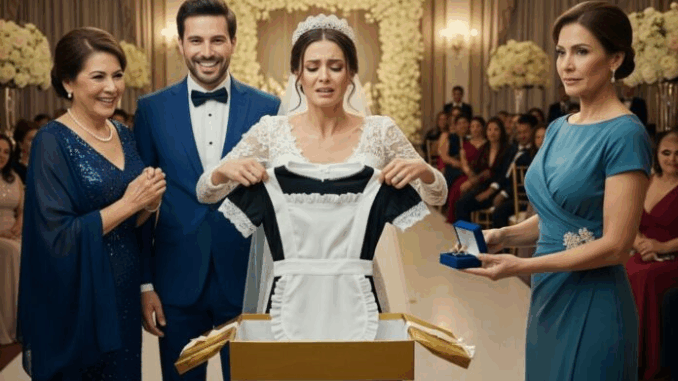 En la boda de mi hija, su suegra le regaló una caja. Al abrirla, encontró un uniforme de limpieza. Mi yerno sonrió y comentó: «Justo lo que necesita en casa». A mi hija se le llenaron los ojos de lágrimas y empezó a temblar. Me levanté en silencio y le dije: «Veamos el regalo que tengo para ti». Al abrir la caja, sus rostros se llenaron de asombro.