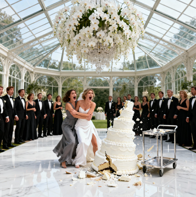 El sonido fue cataclísmico. La torre de siete pisos se tambaleó un segundo y luego se desplomó sobre el suelo de mármol. La porcelana se hizo añicos. Capas de bizcocho y crema estallaron, salpicando a los invitados de la primera fila. Pan de oro y glaseado blanco cubrieron mi vestido y el costoso esmoquin de David.